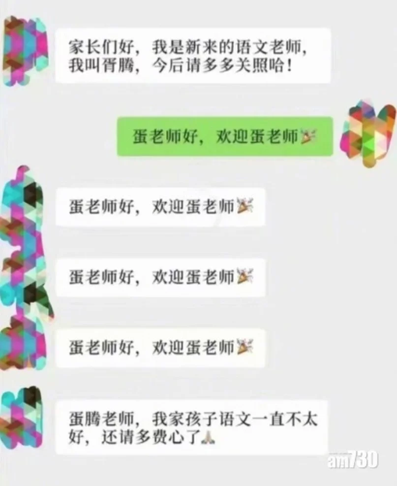 智能電話普及,即時通訊程式內可能有不同群組,如朋友、工作、家教等。大家在群組留言,有時只係回應對方知悉留言,部分人為省時不打字或會複製上一個留言作回應,若「上一手」打錯字,便會一拼「出事」。內地有網民分享,「千萬不要在家長群裡隨便複製黏貼,哈哈笑出腹股」。分享幾則撮圖,當中老師介紹自己「我叫胥騰,……」第一個家長不知看錯還是打錯「蛋老師好……」其他家長亦照複製此回應「蛋老師好……」