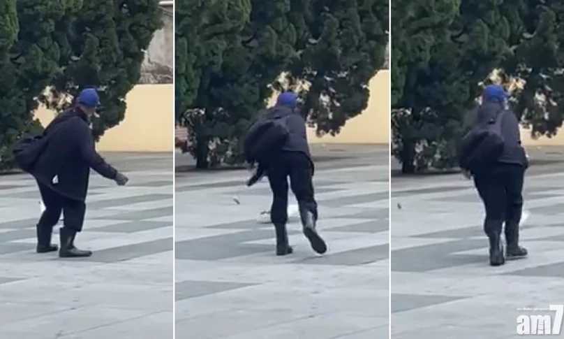 隨後疑似一手擲向白鴿。(片段截圖@FB群組「黃大仙區友(黃大仙,新蒲崗,鑽石山,慈雲山……)」)