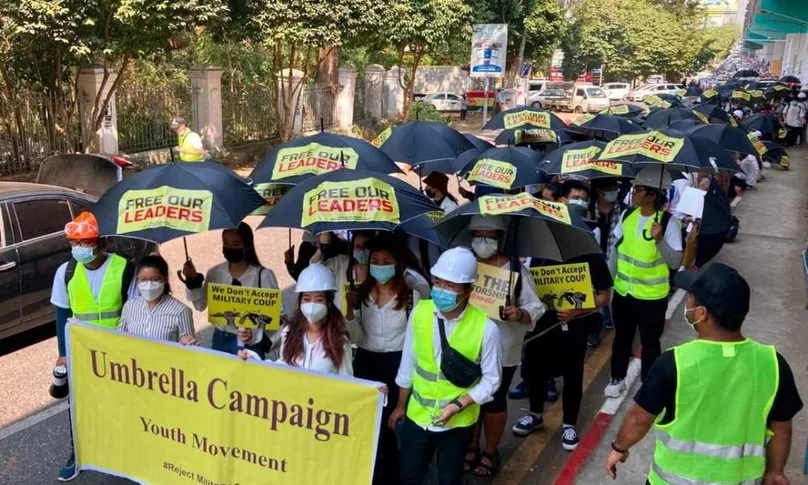 從照片可見,一群青年戴著安全帽、撐起黑色雨傘遊行,黑傘貼上「釋放我們的領袖」的黃色標語,青年手持寫著「雨傘運動、青年運動、#反對軍事政變」的黃色標語帶頭遊行,相信是仿效香港2014年的「雨傘運動」。網民留言「仰光Myaynigone區又有新的青年運動,這是雨傘運動,他們的創意驚人」。