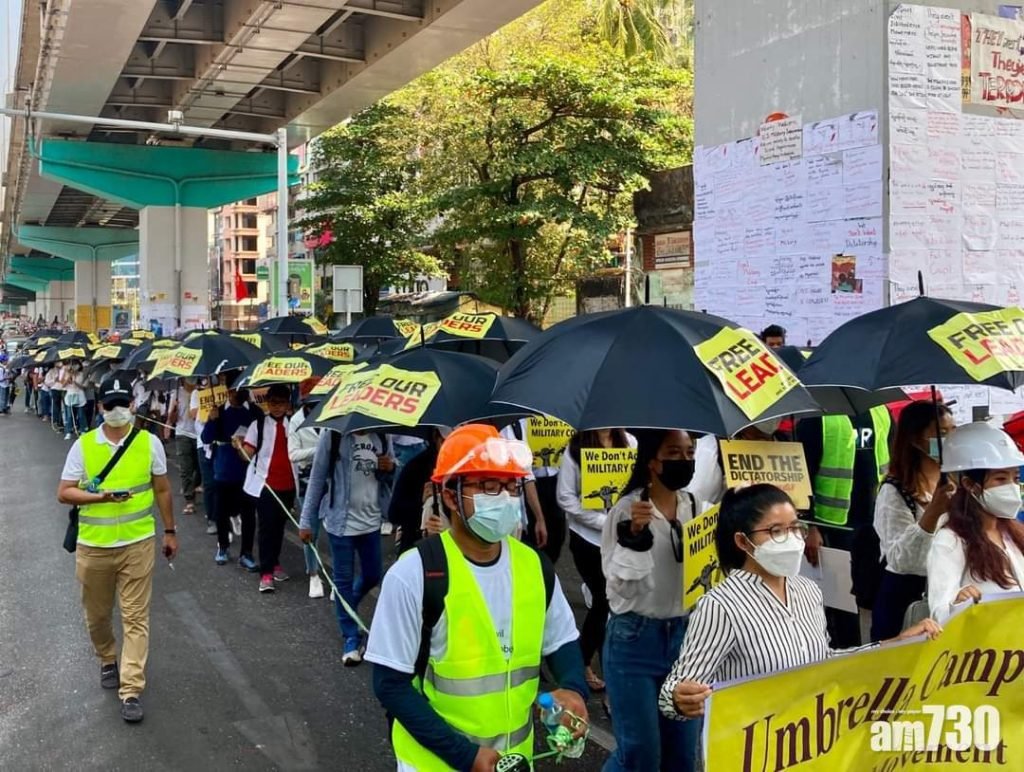 緬甸反軍事政變示威持續近3星期,仰光周三再有大批民眾上街,有網民在Twitter上載照片指仰光青年在Myaynigone區發起雨傘運動。