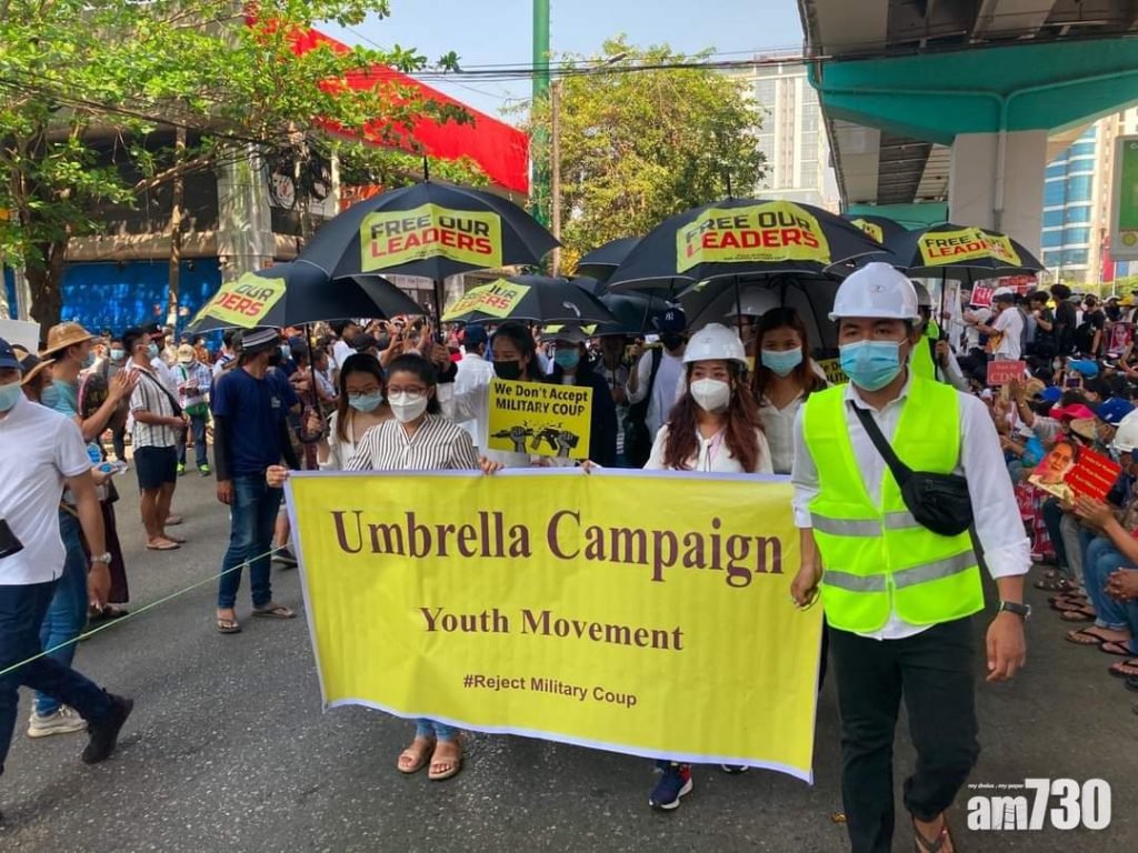 軍事政變|仰光青年撐傘遊行 要求釋放被捕民選領袖