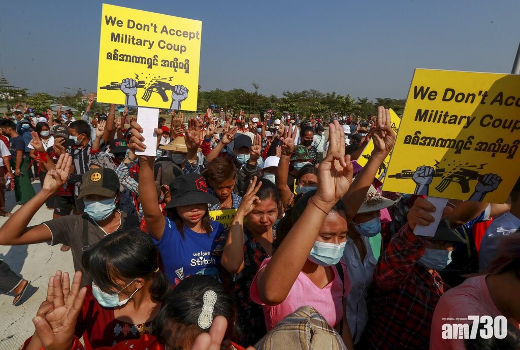 另外,仰光一名上周六在示威中槍身亡的男子舉殯,大批民眾參加喪禮,期間高舉三指抗爭手勢,抗議軍方鎮壓。