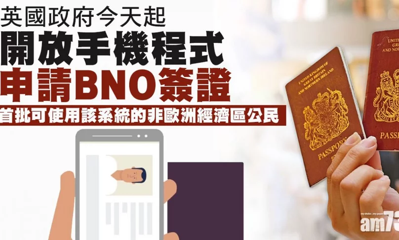 英國政府今日開放手機應用程式,供香港BNO護照持有人通過智能手機掃描並申請到英國的簽證。申請人的BNO護照須有生物特徵,否則仍要親身到簽證申請中心辦理,是首批可使用該系統的非歐洲經濟區公民。透過手機應用程式申請的人士,可自行決定出發日期。