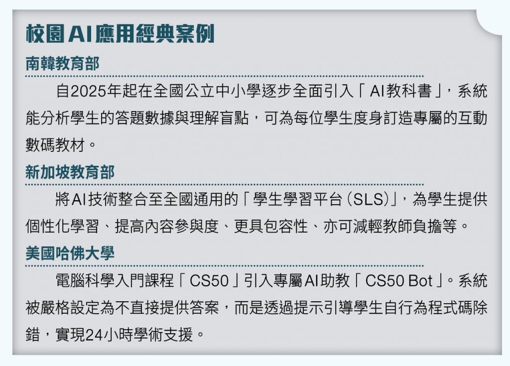 放眼全球,AI教育浪潮已升級為國家或州份級別的戰略部署。南韓教育部正大舉推行涵蓋全國公立學校的「AI教科書」;新加坡推出的中央線上學習平台SIS也導入了AI功能;哈佛大學等頂尖學府,亦早將生成式AI助教引入核心課程(詳見附表)。