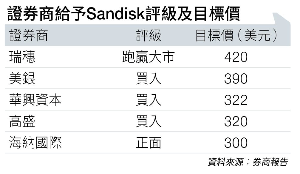 再度現身資本市場,Sandisk食正人工智能(AI)熱潮,市場亦極看好數據中心儲存業務需求帶來的增長潛力,上市不足一年,股價由36美元彈升十倍,曾經突破390美元關口。