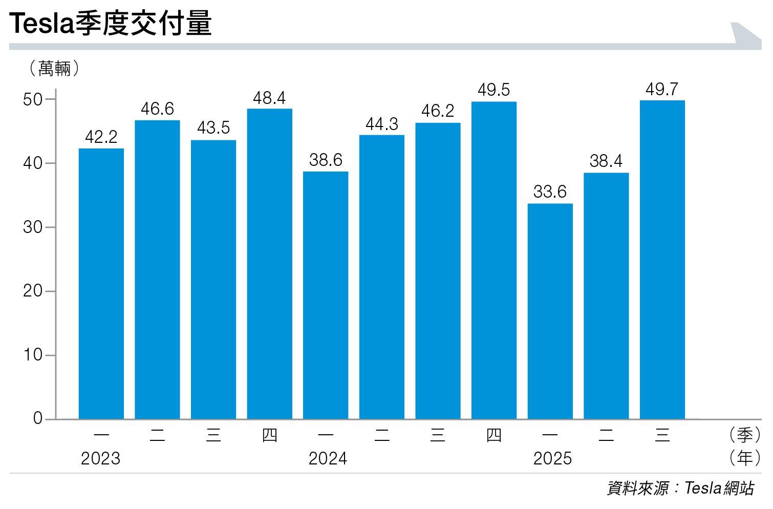 同期交付量創出新高,有超過49.7萬輛(見圖表),按年增加7.4%,按季增加29.4%;Model 3及Model Y交付量48.11萬輛,按年增加9.4%,按季上升28.7%。