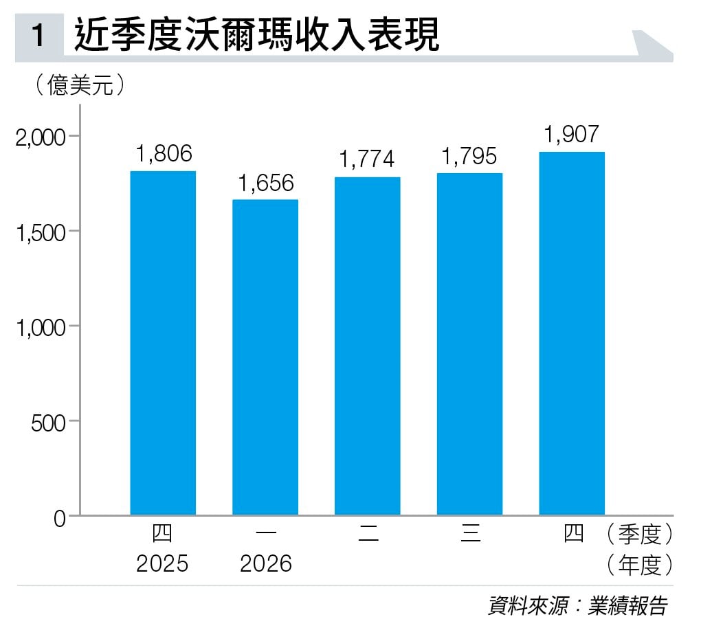 剛公布的最新季度業績,交到功課。截至1月底止第四季度收入1,906.56億美元(見圖表一),按年上升5.6%,好過市場預期;按固定匯率計,增加4.9%。當中淨銷售有1,889.13億美元,增長5.6%;來自美國沃爾瑪的淨銷售佔1,292.23億美元,增長4.6%;來自美國市場以外的國際沃爾瑪,淨銷售則上升11.5%,至359.27億美元;美國山姆會員倉儲式商店淨銷售237.63億美元,增加2.9%。