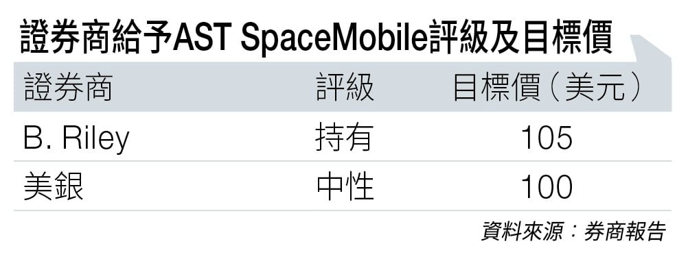 追得最貼要數B. Riley,目標價由95美元上調至105美元(見圖表);美銀亦於今年初將目標價由85美元調高至100美元,但仍然落後AST SpaceMobile火箭般的升勢。