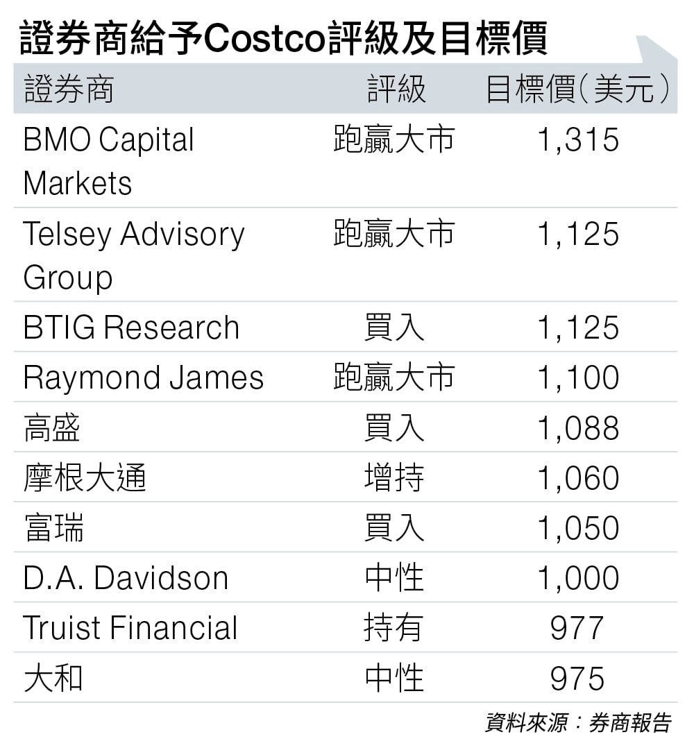 因應季績好過市場預期後,券商BTIG隨即將Costco目標價,由1,115美元調高至1,125美元,維持「買入」評級(見圖表)。