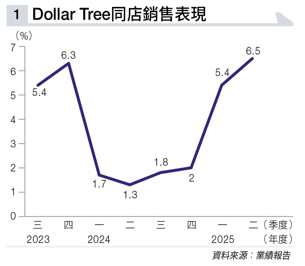 業績方面,Dollar Tree截至8月2日止第二季度淨銷售45.67億美元,按年增長12.3%,高過市場預期。同店銷售增長6.5%(見圖表一),當中約3%是來自客流量增加;另約3.4%是來自單價上升。