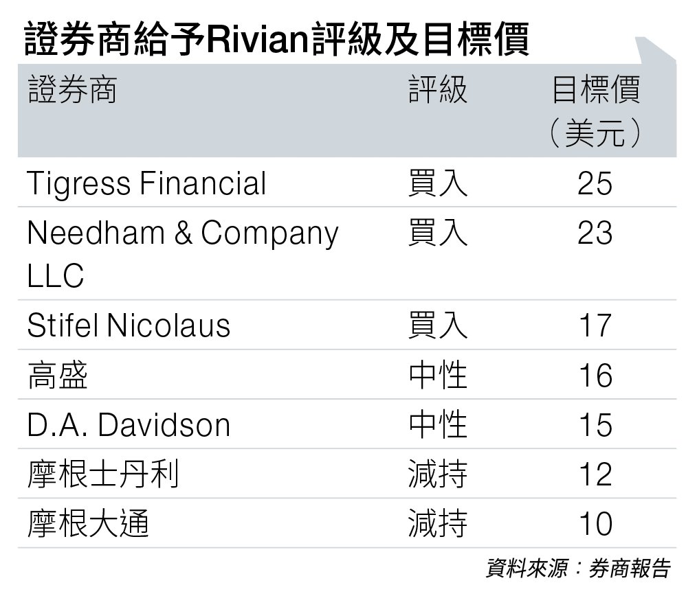 Needham將Rivian目標價由14美元大幅調高至23美元(見圖表),維持「買入」評級。該行看好公司的垂直綜合策略,可鞏固其競爭優勢與龍頭對戰。