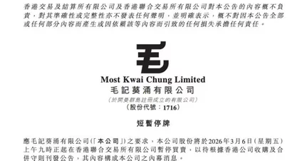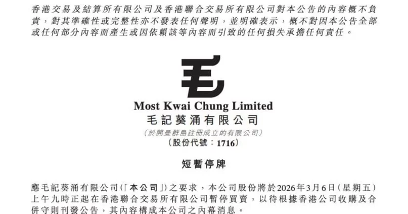 今日(3月6日)港股開市前迎來一單突發消息!「100毛」母企毛記葵涌(01716)宣佈,公司股份將於今日上午 9 時正起短暫停止買賣。對於一眾香港散戶嚟講,毛記葵涌絕對充滿集體回憶,當年 IPO 掛牌時超額認購幾千倍、萬人空巷抽新股嘅畫面依然歷歷在目。如今突然宣佈停牌,市場即刻議論紛紛,究竟「腦細」們葫蘆裏賣緊咩藥?