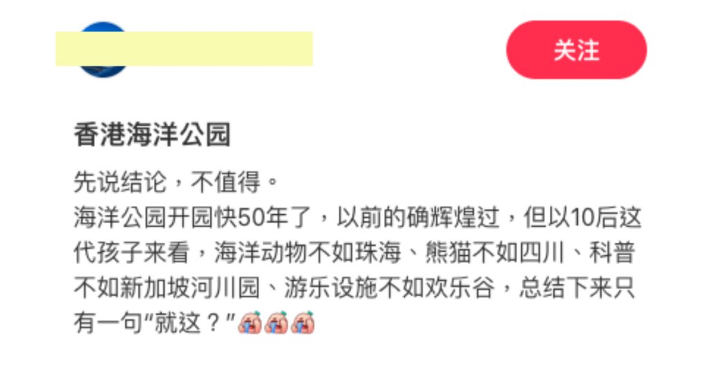 儘管海洋公園近日公布業績顯示入場人次有所回升,但在社交平台上,卻有內地網民發表尖銳評論,直指以新一代(10後)孩子的眼光來看,海洋公園在各方面均已被區內其他主題公園超越,吸引力大不如前。該名網民在小紅書上發帖稱,海洋公園雖然歷史悠久,但其各項設施及體驗,相較區內其他更專業化的樂園已顯得遜色: