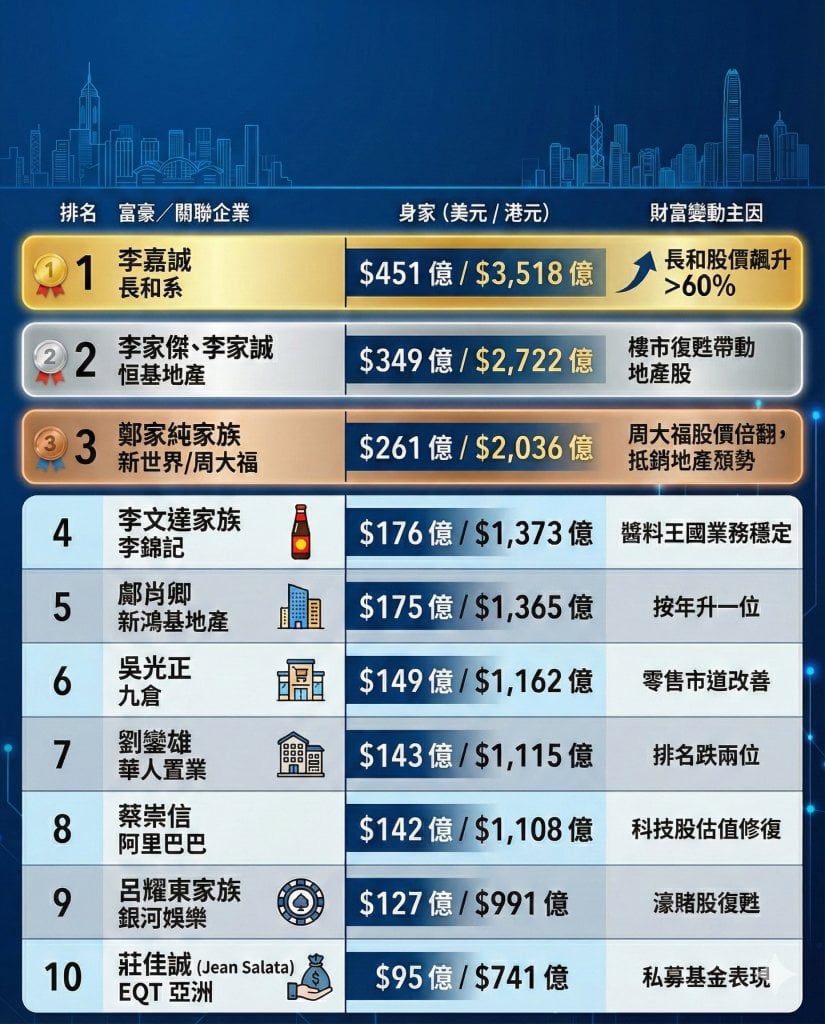 | 排名 | 富豪 / 家族 | 關聯企業 | 身家 (美元 / 港元) | 財富變動主因 |
