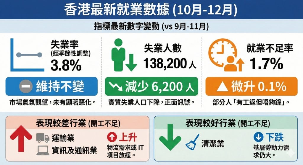 政府統計處今日公布最新勞動人口統計數字,香港就業市場繼續保持平穩。去年 10 月至 12 月經季節性調整的失業率維持在 3.8%,與上一期(9 月至 11 月)持平。雖然比率不變,但好消息是失業大軍人數實質有所減少,反映部分市民成功重投職場。