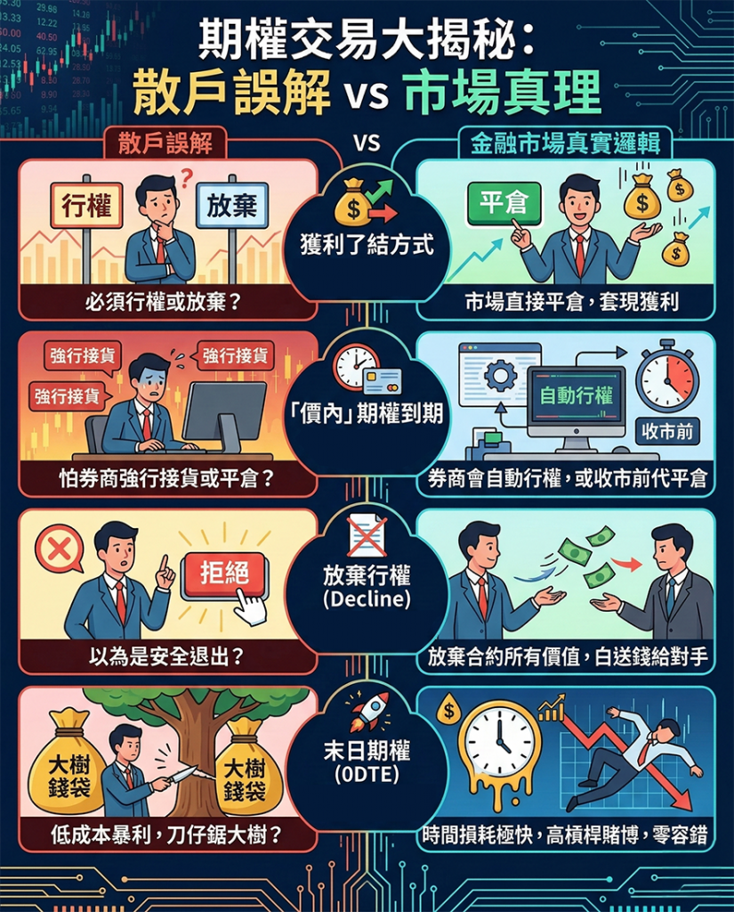 | 獲利了結方式 | 以為必須處理「行權」或「放棄」 | 直接在市場上「平倉 (Sell to Close)」即可套現 | 混淆了「期權交易」與「期權行使」兩個完全不同的情況。 |