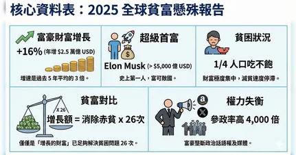 | 權力失衡 | 參政率高 4,000 倍 | 指富豪壟斷政治話語權及媒體 (Amazon, X)。 |