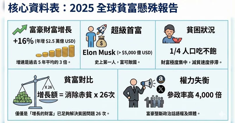 | 富豪財富增長 | +16% (年增 $2.5 萬億 USD) | 增速是過去 5 年平均的 3 倍。 |