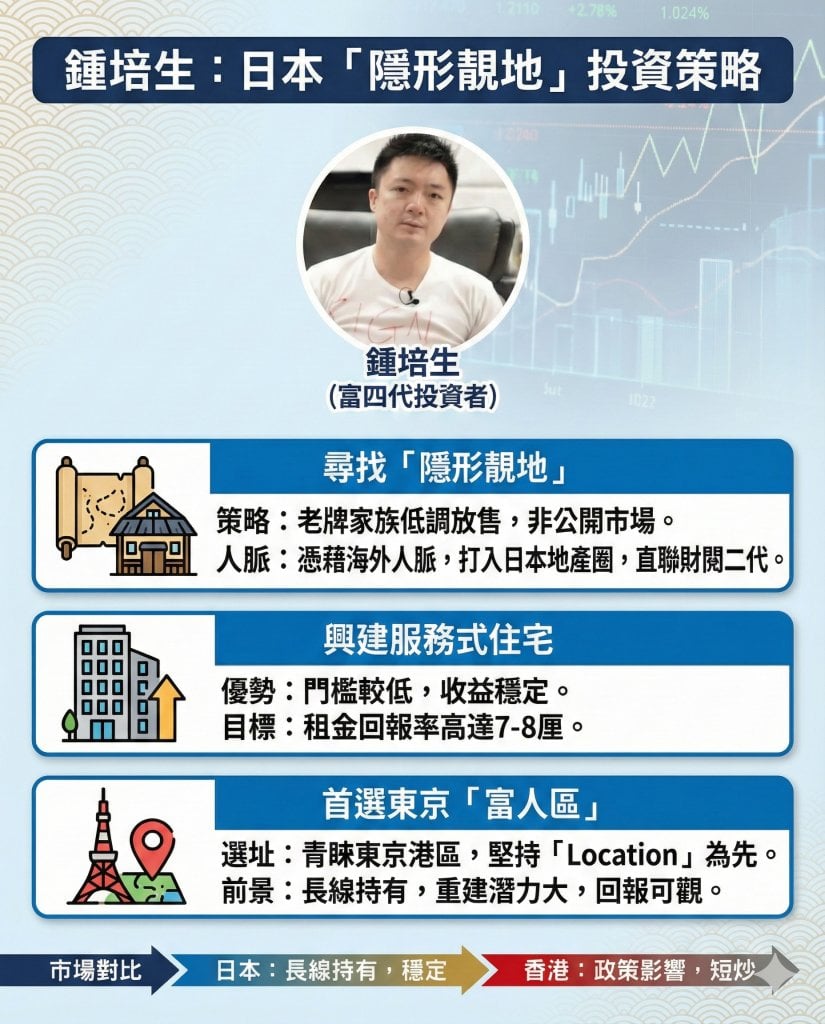鍾培生指出,其策略是尋找並非公開在市場放售的「隱形靚地」。這類土地通常由日本老牌家族持有,因面臨傳承問題而低調放售。憑藉其在外國求學時建立的人脈,他成功打入日本地產圈子,直接與當地發展商及財閥二代建立聯繫。