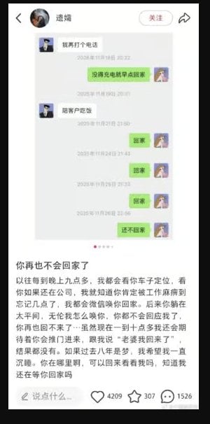 內地互聯網「996」加班文化再釀悲劇。廣州一名 32 歲 程式員 高廣輝,於 11 月 29 日(周六)在家加班期間突發身體不適,送院搶救無效死亡。事件最令人震驚的細節在於,就在他處於彌留之際甚至離世後,工作的「追魂 Call」仍未停止。同事在他搶救期間將其拉入新群組,甚至在他死後發訊息要求修改程式。