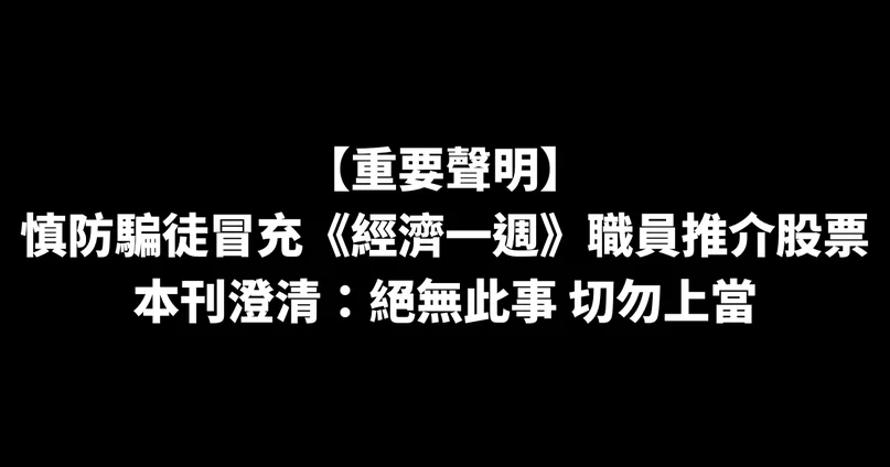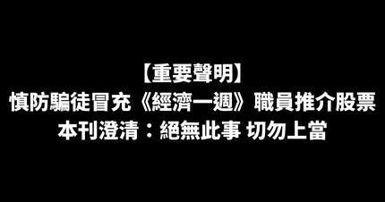 【重要聲明】慎防騙徒冒充《經濟一週》職員推介股票 本刊澄清:絕無此事 切勿上當