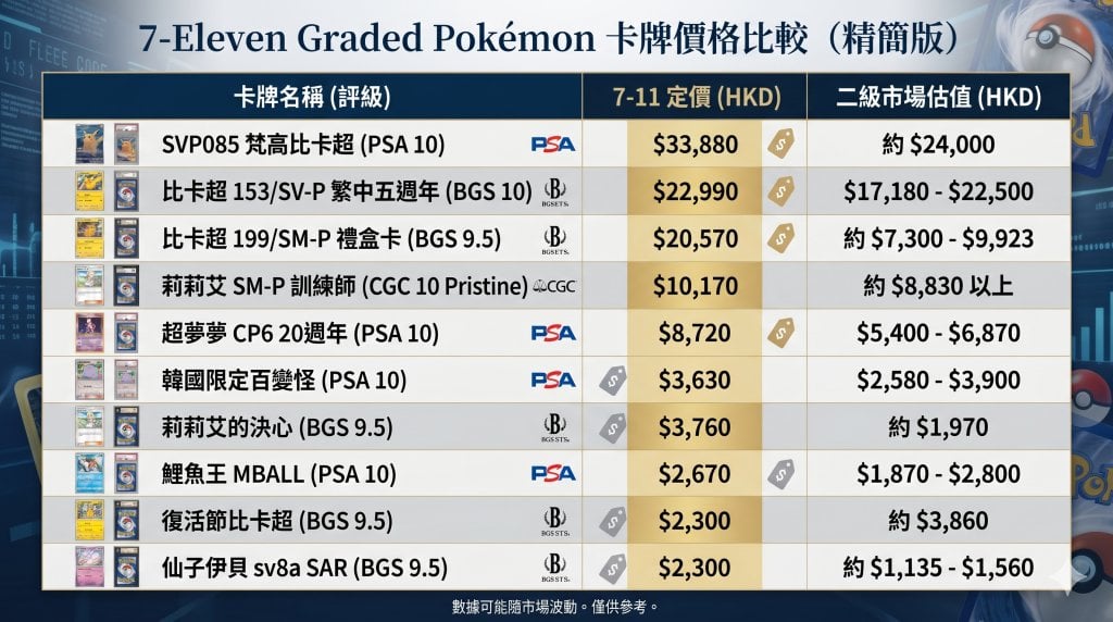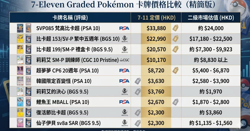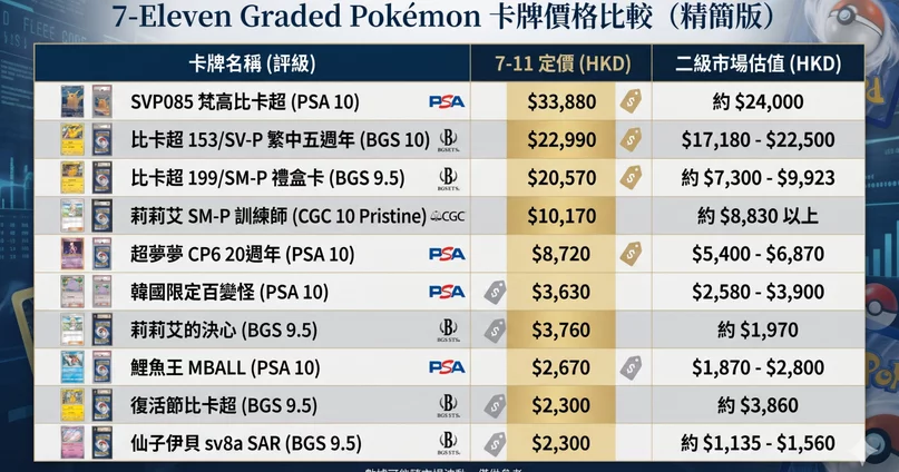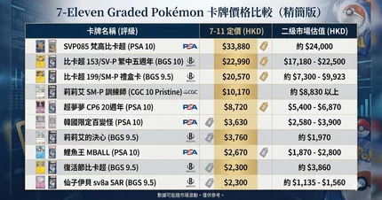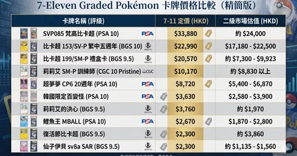 | 卡牌名稱 (評級) | 7-11 定價 (HKD) | 二級市場估值 (HKD) | 宏觀科技/財金客觀洞察 |