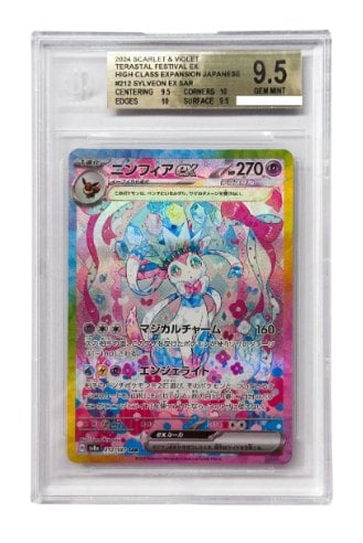 歷史與受歡迎原因:出自 2024 年底的高階擴充包「Terastal Festival ex (sv8a)」的 SAR 卡。仙子伊貝(伊布家族)一直是市場上的吸金保證。市場售價:香港 7-11 定價為港幣 $2,300。外國網站顯示 BGS 9.5 均價為 $145 美元(約港幣 $1135),eBay 成交價約 $189 – $200 USD(約 $1,560 HKD)。