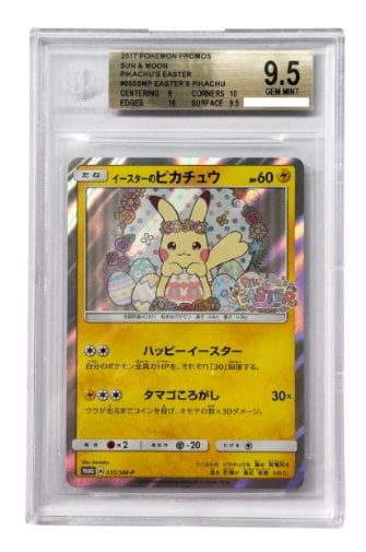歷史與受歡迎原因:2017 年復活節活動限定的 Promo 卡,因其節慶主題與極具特色的可愛畫風而成為比卡超愛好者的熱門收藏。市場售價:香港 7-11 定價為港幣 $2,300。外國網站顯示 BGS 9.5 均價約為 $495 美元(約港幣 $3,860),eBay 成交價落在 $480 – $520 美元之間。此卡在 7-11 的定價相對貼近或略低於國際二級市場均價。留意此卡的 9.5 評級與 10 分評級,價格相比可差達 6 倍以上。