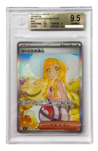 歷史與受歡迎原因:出自 2017 年的「莉莉艾與科斯莫古特別盒」。莉莉艾是寶可夢歐美支持者的「妹卡文化(Waifu Card)」絕對核心,因其在遊戲與動畫中立體的角色成長,極受藏家追捧。市場售價:香港 7-11 定價為 $10,170。而在 eBay 上,完美的 CGC 10 Pristine 成交比較少見,但以 CGC 10 Pristine CGC 10 PSA 10 的坊間規則下,PSA 10 在外國及日本的售價為約 150,000 至 180,000 日圓(約港幣 $7,360 至 $8,830),故此 CGC 10 Pristine 會高出此價格亦非常合理。CGC 評級用戶多以收藏家為主,一般人則會選擇交易流通量較佳的 PSA 評級。