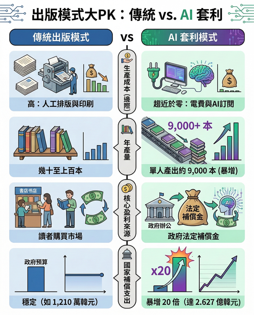 | 內容 | 傳統出版模式 | AI 套利模式 | 洞察 |