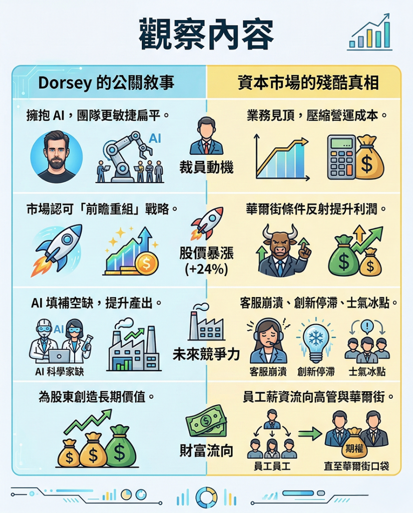 商業拆局: 目前根本沒有任何一家成熟企業的 AI 工具,能夠瞬間替代 50% 勞動力而維持營運不墜。潛台詞其實係:「我哋過去大放水時代亂請人、亂擴張(例如收購音樂平台 Tidal),依家增長停滯,唯有用員工嘅屍骸祭旗,換取下季度嘅漂亮財報。」Dorsey 聰明地為這把屠刀披上了一件名為「AI 生產力」的閃亮外衣,成功將敘事由「公司陷入困境」扭轉為「公司極具前瞻性」。