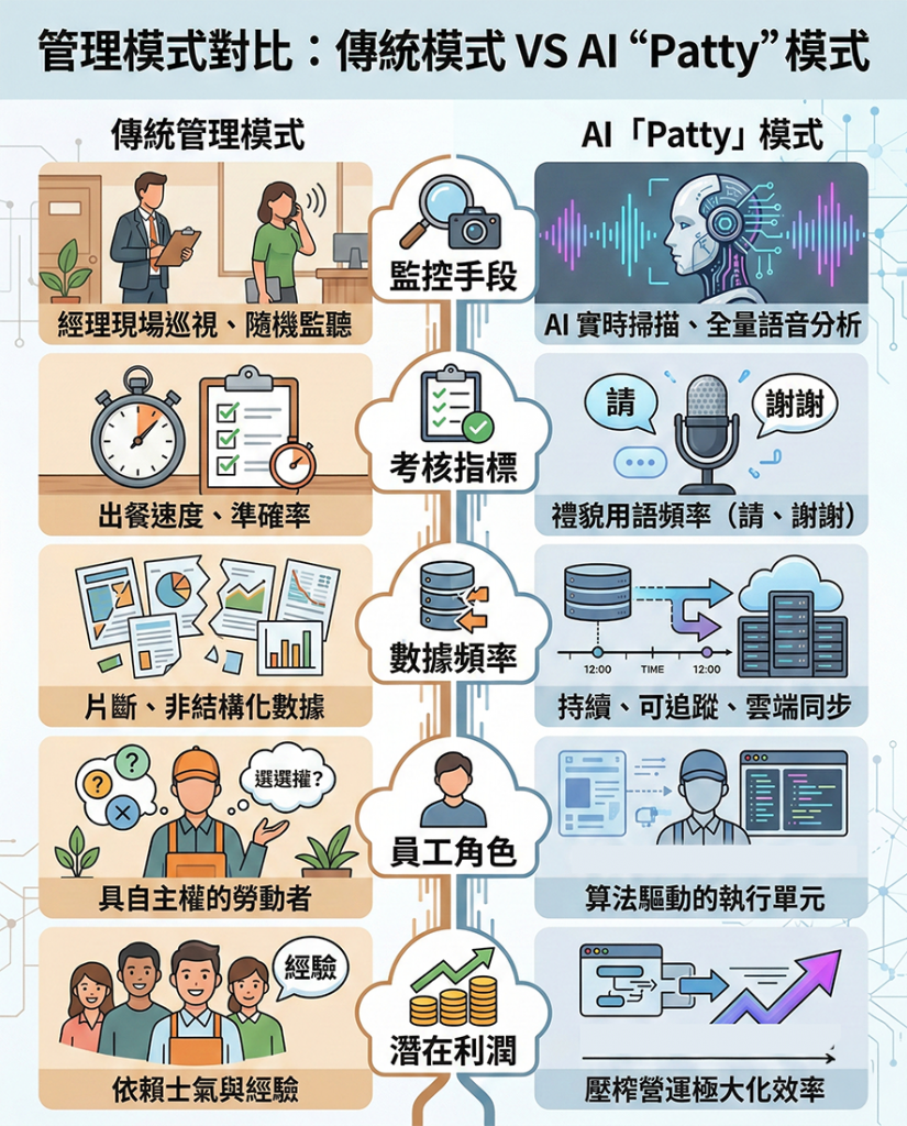 | 考核指標 (KPI) | 出餐速度、訂單準確率、客訴率。 | 禮貌用語(請、謝謝)觸發頻率。 | 人類情感互動被強行「關鍵字化」,勞動力加速去人性化(Dehumanization)。 |