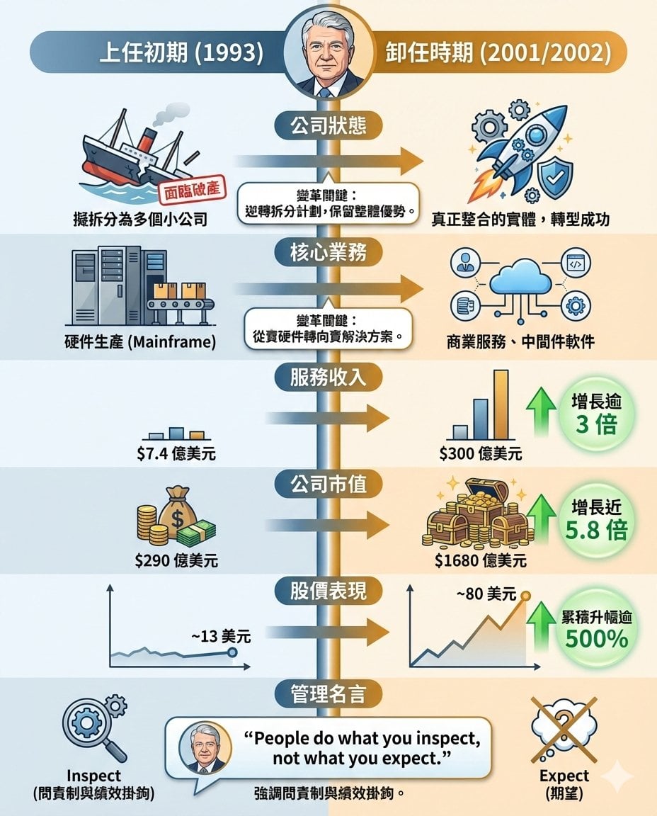 | 核心業務 | 硬件生產 (Mainframe) | 商業服務、中間件軟件 | 從賣硬件轉向賣解決方案。 |