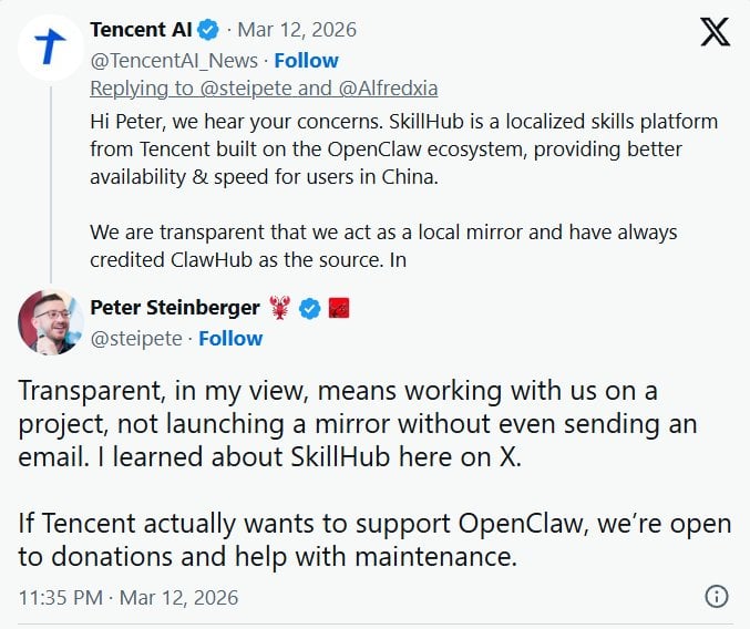 為了爭奪這塊肥肉,騰訊在 2026 年 3 月初火速推出本土化技能平台「SkillHub」。經網民舉報後,此行為觸怒了 OpenClaw 創辦人 Peter Steinberger。他在社交平台 X 發炮,直指對方未經授權,以超高重覆抓取次數,下載 ClawHub 超過 13,000 個技能碼,硬生生將他的開源伺服器成本推至過萬美金。
