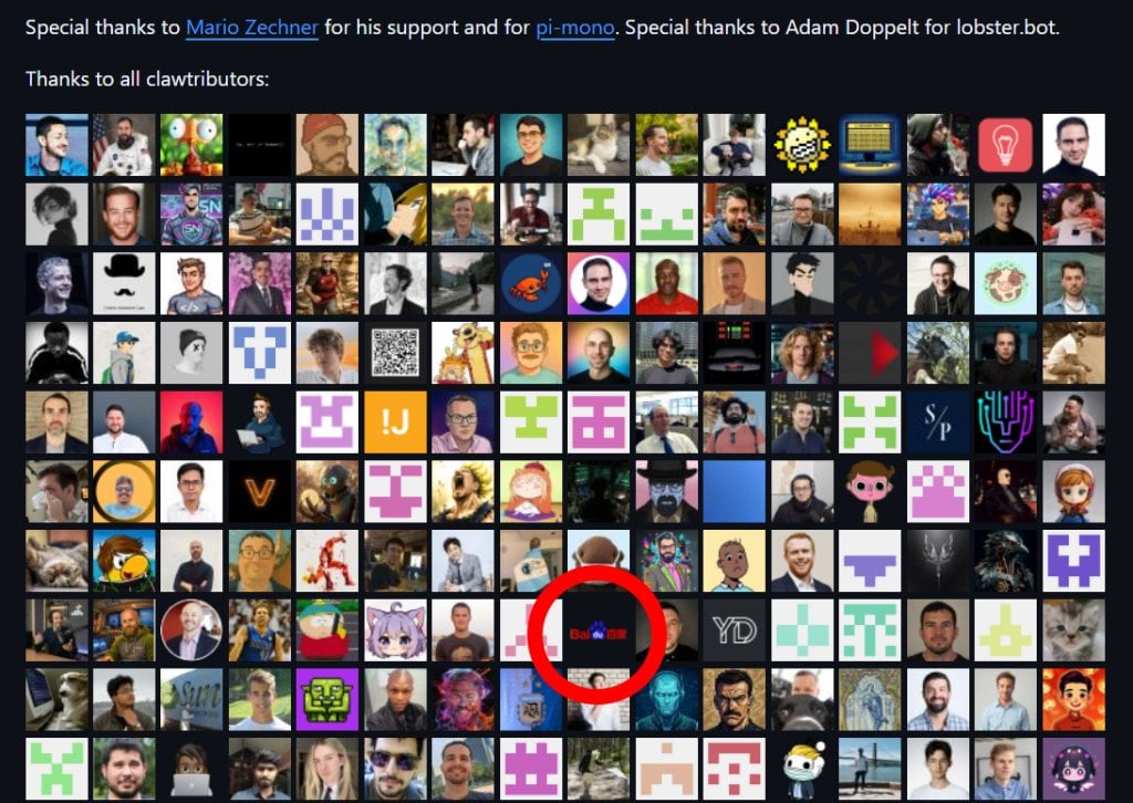 (圖片來源:資料圖片)百度在近日登上了 OpenClaw 的「貢獻者(或贊助人)」名單(紅圈示)